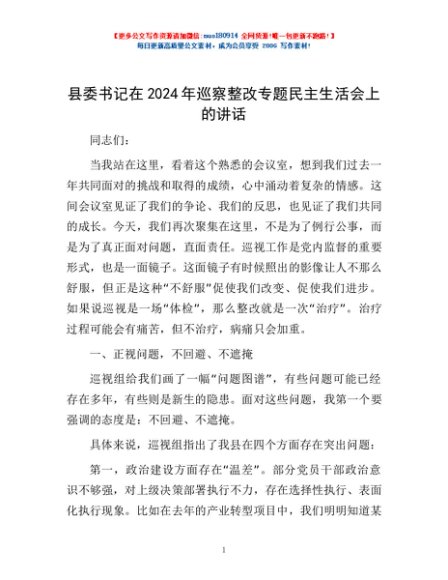 / 县委书记在2024年巡察整改专题民主生活会上的讲话
