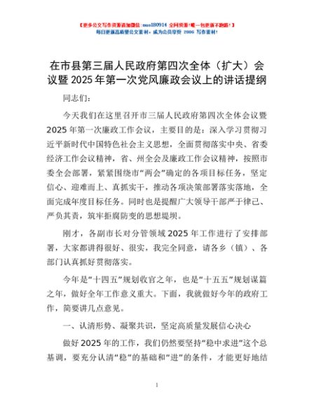 / 在市县第三届人民政府第四次全体(扩大)会议暨2025年第一次党风廉政会议上的讲话提纲