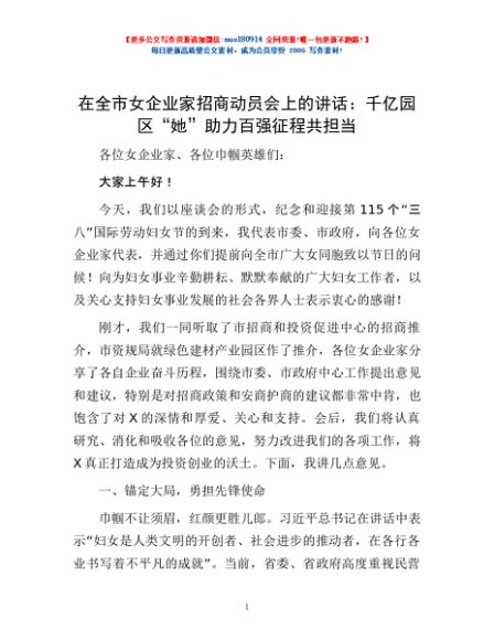 / 在全市女企业家招商动员会上的讲话:千亿园区“她”助力百强征程共担当