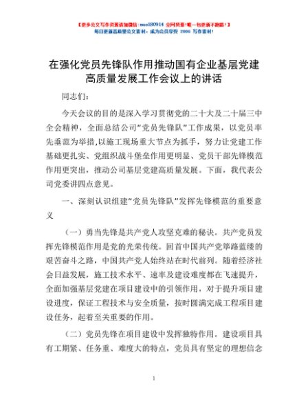 / 在强化党员先锋队作用推动国有企业基层党建高质量发展工作会议上的讲话