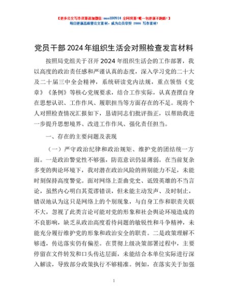/ 党员干部2024年组织生活会对照检查发言材料
