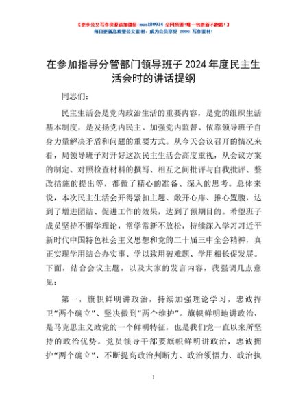 / 在参加指导分管部门领导班子2024年度民主生活会时的讲话提纲