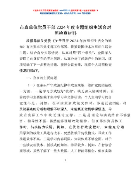 / 市直单位党员干部2024年度专题组织生活会对照检查材料