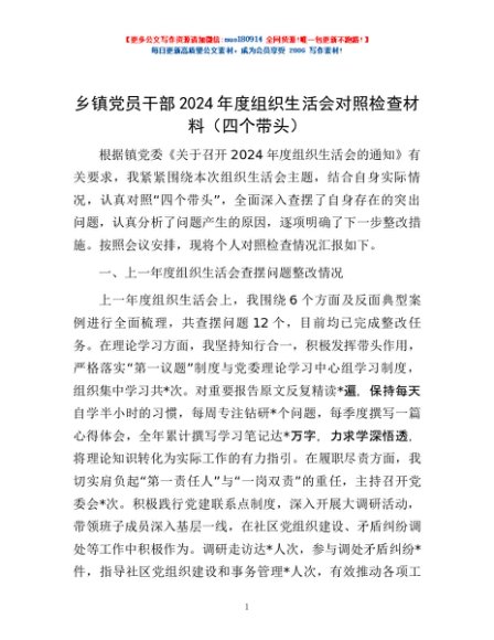 / 乡镇党员干部2024年度组织生活会对照检查材料(四个带头)