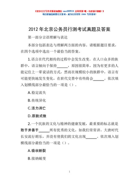 2012年北京公务员行测考试真题及答案