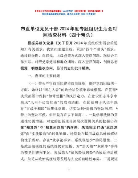 / 市直单位党员干部2024年度专题组织生活会对照检查材料(四个带头)