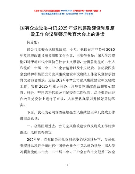 / 国有企业党委书记2025年党风廉政建设和反腐败工作会议暨警示教育大会上的讲话