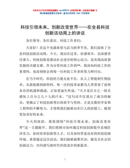 / 科技引领未来,创新改变世界——在全县科技创新活动周上的讲话