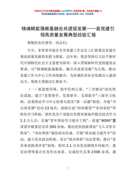 / 铸魂赋能强根基 融合共进促发展——县党建引领高质量发展典型经验汇报