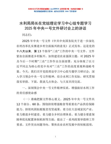 / 水利局局长在党组理论学习中心组专题学习2025年中央一号文件研讨会上的讲话