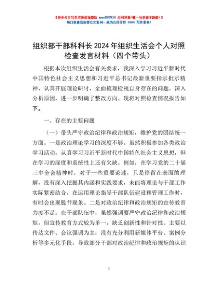 / 组织部干部科科长2024年组织生活会个人对照检查发言材料(四个带头)