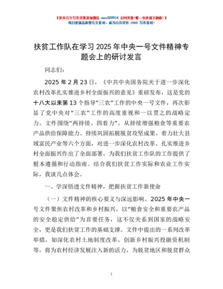 / 扶贫工作队在学习2025年中央一号文件精神专题会上的研讨发言