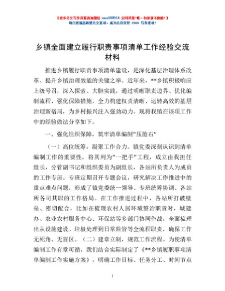 / 乡镇全面建立履行职责事项清单工作经验交流材料