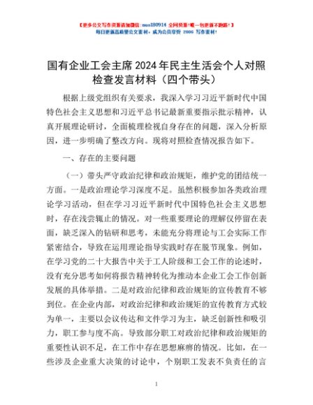 / 国有企业工会主席2024年民主生活会个人对照检查发言材料(四个带头)