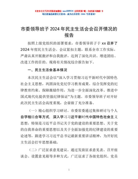 / 市委领导班子2024年民主生活会会召开情况的报告