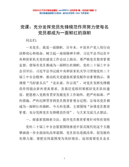 / 党课:充分发挥党员先锋模范作用 努力使每名党员都成为一面鲜红的旗帜