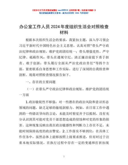 / 办公室工作人员2024年度组织生活会对照检查材料