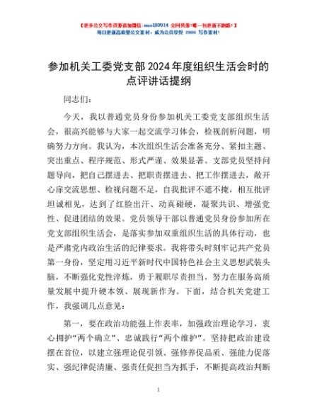 / 参加机关工委党支部2024年度组织生活会时的点评讲话提纲