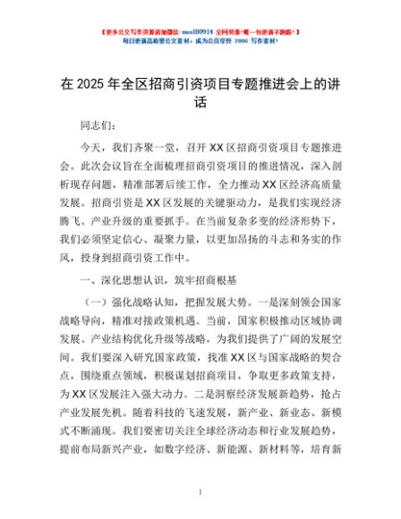 / 在2025年全区招商引资项目专题推进会上的讲话