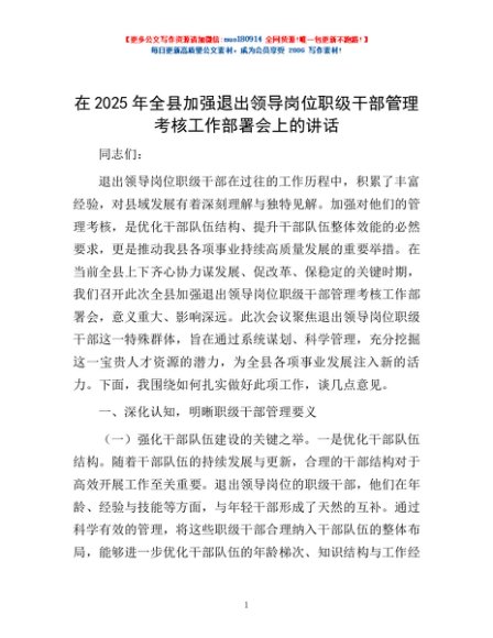 / 在2025年全县加强退出领导岗位职级干部管理考核工作部署会上的讲话