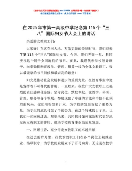 / 在2025年市第一高级中学纪念第115个“三八”国际妇女节大会上的讲话