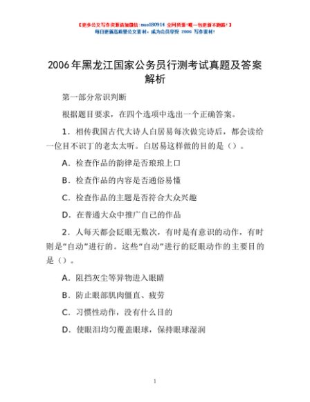 2006年黑龙江国家公务员行测考试真题及答案解析