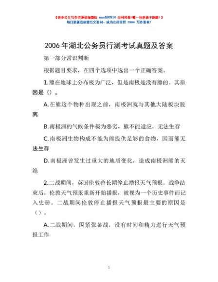 2006年湖北公务员行测考试真题及答案