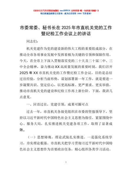 / 市委常委、秘书长在2025年市直机关党的工作暨纪检工作会议上的讲话