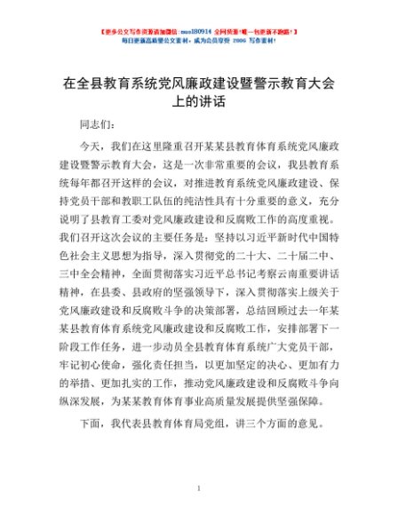 / 在全县教育系统党风廉政建设暨警示教育大会上的讲话