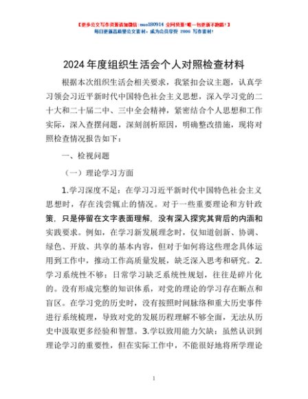/ 2024年度组织生活会个人对照检查材料