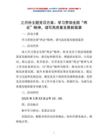 三月份主题党日方案:学习贯彻全国“两会”精神,谱写高质量发展新篇章
