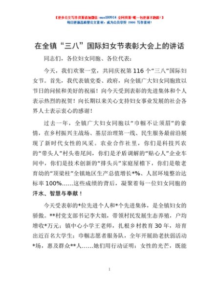 / 在全镇“三八”国际妇女节表彰大会上的讲话