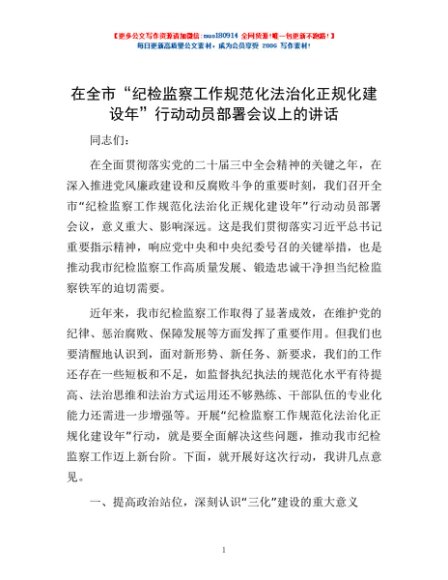 / 在全市“纪检监察工作规范化法治化正规化建设年”行动动员部署会议上的讲话