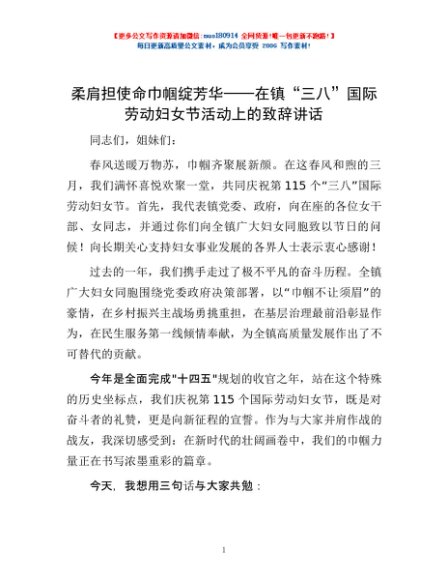 柔肩担使命 巾帼绽芳华——在镇“三八”国际劳动妇女节活动上的致辞讲话