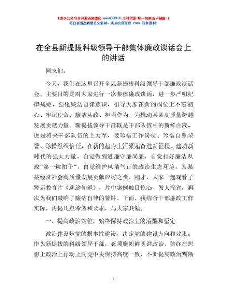 / 在全县新提拔科级领导干部集体廉政谈话会上的讲话