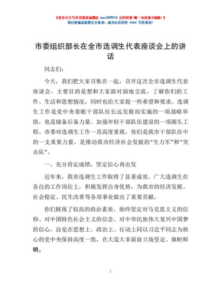 / 市委组织部长在全市选调生代表座谈会上的讲话
