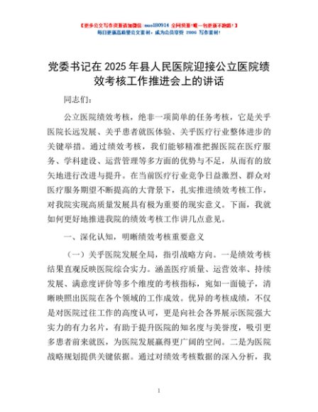 / 党委书记在2025年县人民医院迎接公立医院绩效考核工作推进会上的讲话