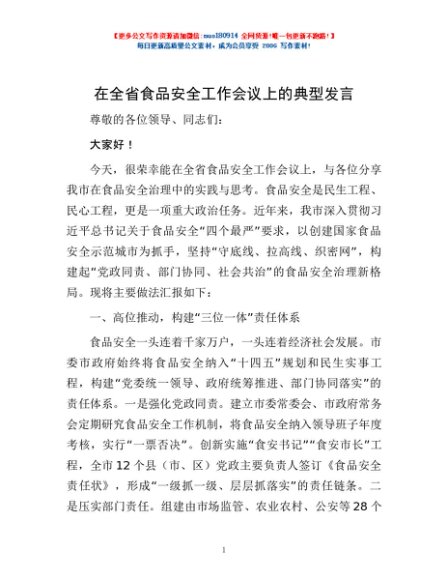 / 在全省食品安全工作会议上的典型发言