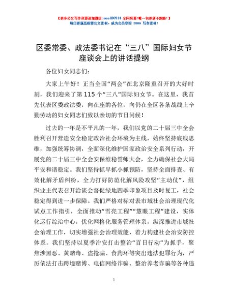 / 区委常委、政法委书记在“三八”国际妇女节座谈会上的讲话提纲