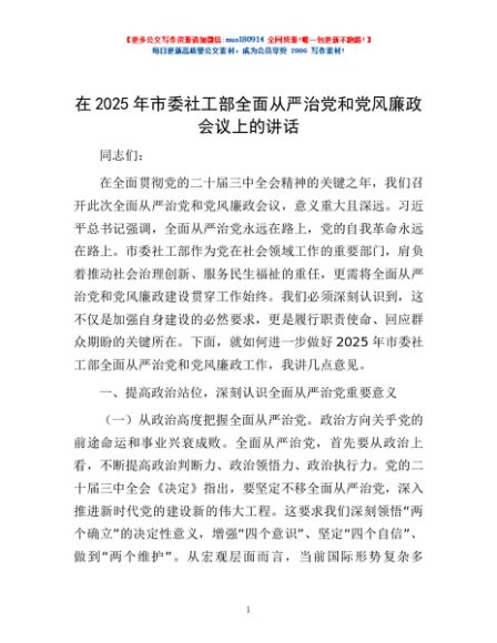 / 在2025年市委社工部全面从严治党和党风廉政会议上的讲话
