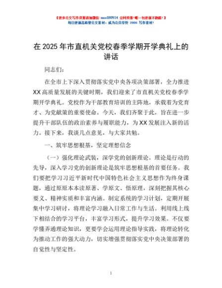 / 在2025年市直机关党校春季学期开学典礼上的讲话