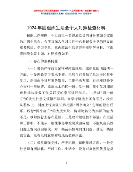 / 2024年度组织生活会个人对照检查材料