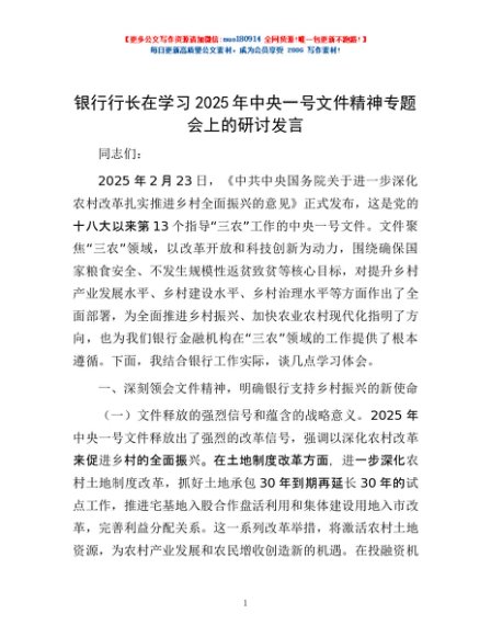 / 银行行长在学习2025年中央一号文件精神专题会上的研讨发言