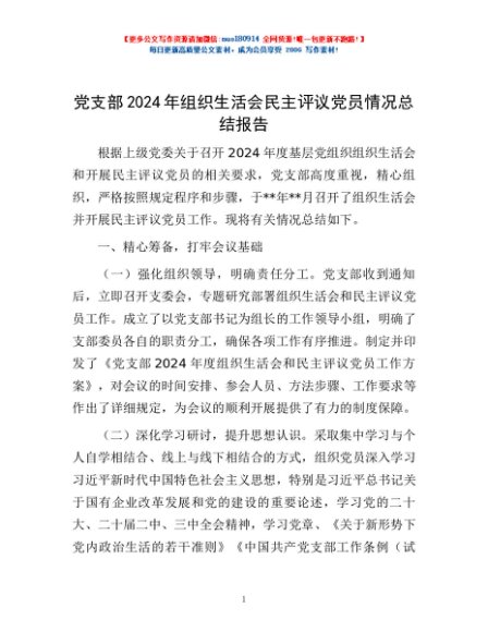/ 党支部2024年组织生活会民主评议党员情况总结报告
