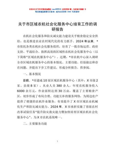 / 关于市区域农机社会化服务中心培育工作的调研报告