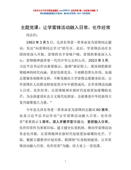 / 主题党课:让学雷锋活动融入日常、化作经常
