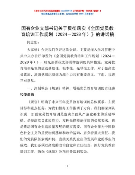 / 国有企业支部书记关于贯彻落实《全国党员教育培训工作规划(2024-2028年)》的讲话稿