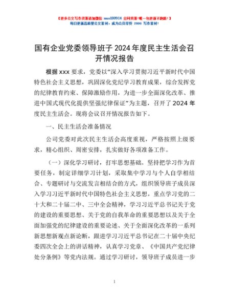 / 国有企业党委领导班子2024年度民主生活会召开情况报告