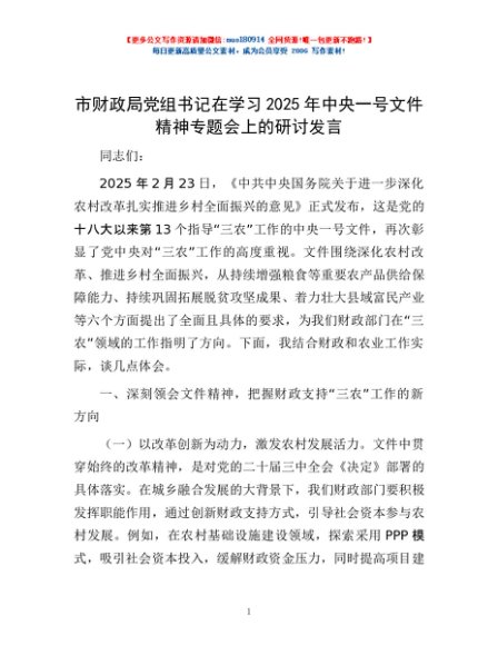 / 市财政局党组书记在学习2025年中央一号文件精神专题会上的研讨发言