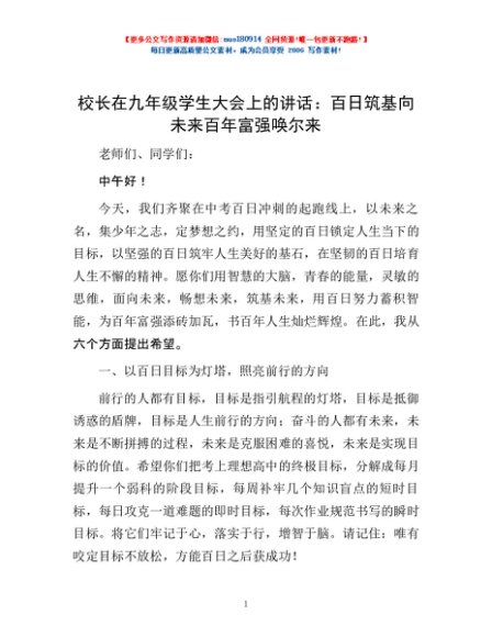 / 校长在九年级学生大会上的讲话:百日筑基向未来 百年富强唤尔来